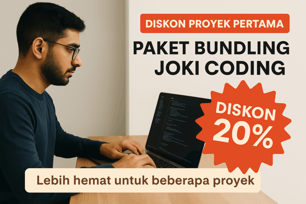 Untuk memberikan nilai tambah dan pengalaman yang lebih menyenangkan, banyak penyedia layanan joki coding kini menawarkan diskon proyek pertama serta paket bundling hemat. Dua penawaran ini tidak hanya meringankan beban biaya pengguna, tetapi juga meningkatkan kepercayaan dan kenyamanan dalam menggunakan layanan.